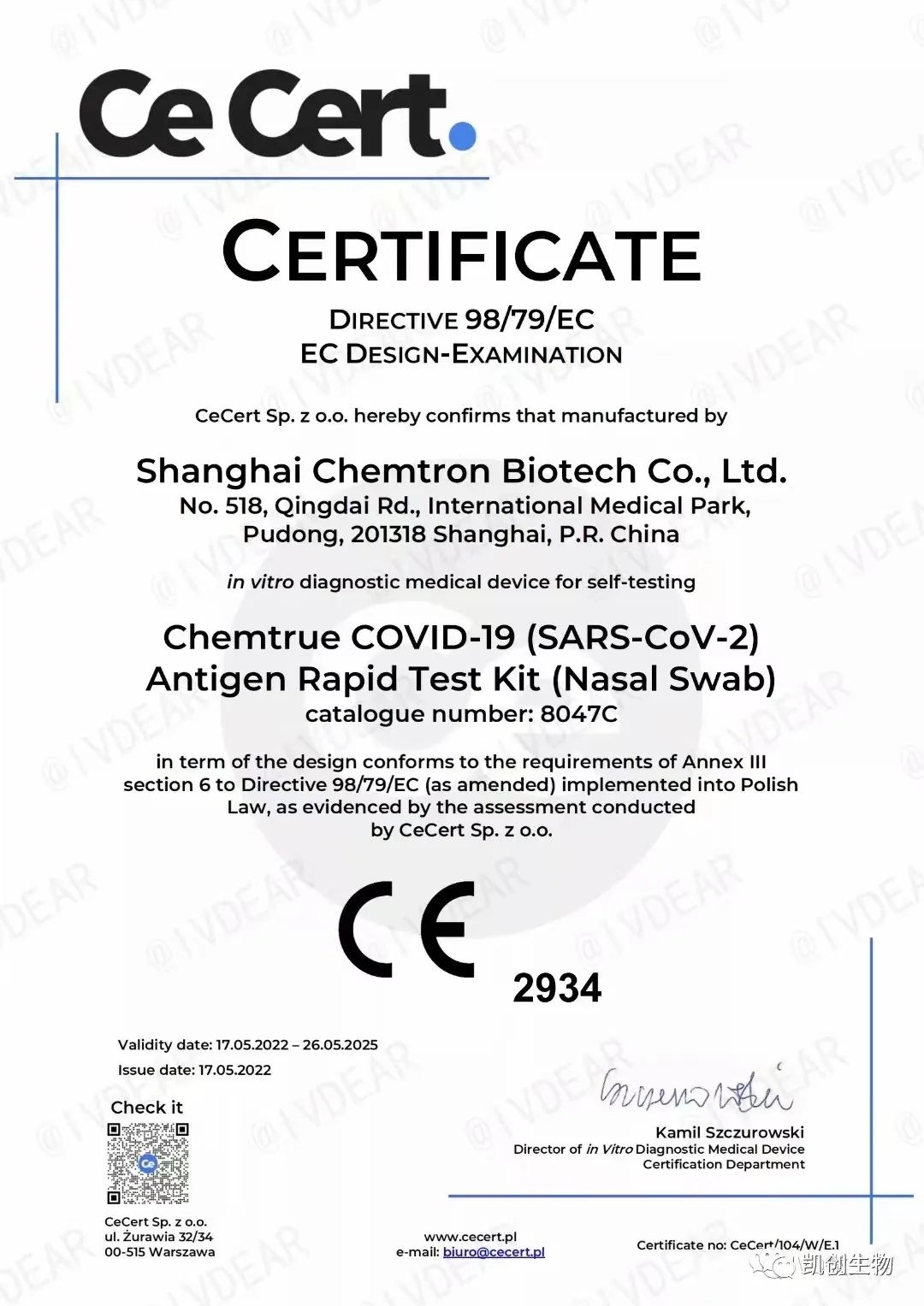 上海凱創生物技術有限公司研發的新型冠狀病毒(SARS-CoV-2)快速抗原檢測試劑盒(免疫層析法)自測產品獲得歐盟CE準入資格!這意味著該自測試劑盒可在歐盟國家以及認可歐盟CE認證的國家進行銷售。